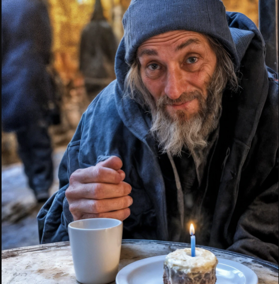 Vestito di stracci, con il volto segnato dal tempo e gli occhi stanchi, ma vivi, cercava di avvicinarsi ai clienti chiedendo qualche moneta.