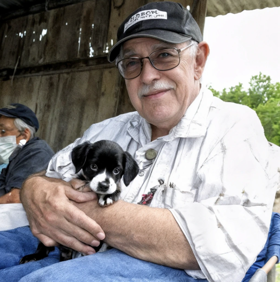 Con le ginocchia dolenti, si chinò e scoprì un cucciolo bianco e nero, tremante, con grandi occhi imploranti. Attaccato alla scatola, un biglietto sbiadito diceva: “Abbi cura di lui!”