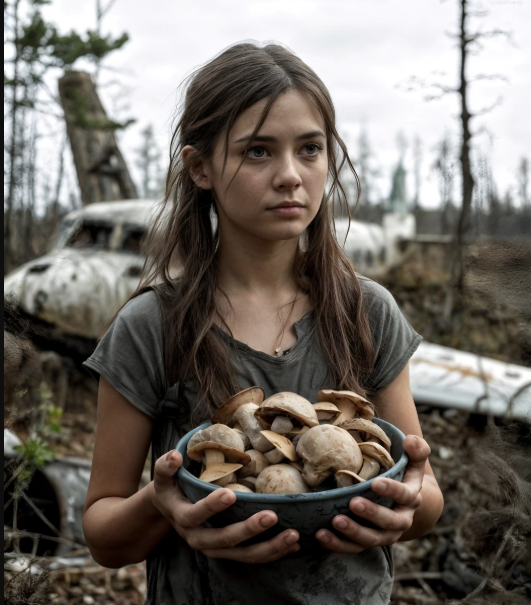 Il terzo giorno, stanca di pulire e sistemare, si addentrò nel bosco in cerca di funghi, desiderosa di un momento di distrazione. Camminò a lungo, finché non raggiunse una radura insolita: muschio soffice sotto i piedi e, al centro, un relitto quasi surreale—un aereo, antico e arrugginito, inglobato dalla natura come fosse lì da secoli.