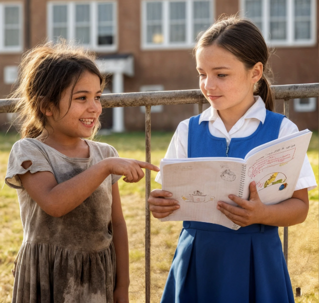Su una panchina, accanto alla sabbiera, sedeva una ragazzina poco più grande di Emily. Indossava vestiti troppo larghi e una giacca di jeans consumata. I capelli spettinati, le scarpe lise con la suola bucata. Con un bastoncino tracciava formule nella terra, come se fosse la cosa più naturale del mondo. Emily, incuriosita, si avvicinò senza timore.