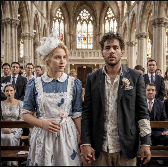 Clara Hayes, giovane tata, aspettava all’altare con il respiro corto. Indossava la divisa blu ormai scolorita e un velo semplice fermato con dita che tremavano. Nella mano, solo un garofano rosa — tutto ciò che poteva permettersi.