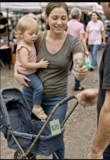 In fondo alla fila, appoggiato a un tavolo pieghevole coperto di vestitini da bambino, c’era un passeggino.