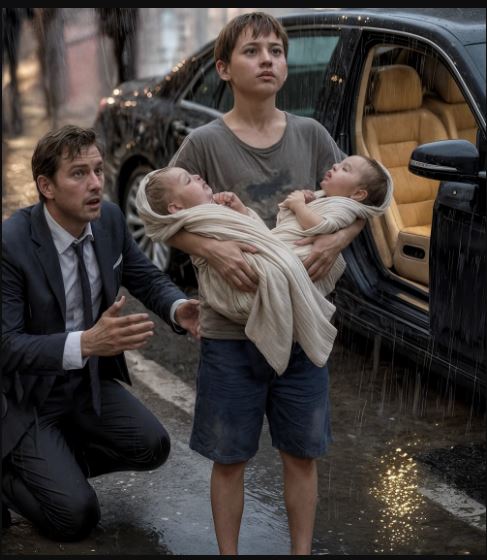 Adrian abbassò il finestrino: un’ondata di vento e acqua ghiacciata invase l’abitacolo. Solo allora vide con chiarezza: ciò che il ragazzo stringeva non era un sacco qualunque. Erano due neonate, avvolte in coperte sottili, i loro vagiti deboli quasi annullati dal rumore della pioggia.
