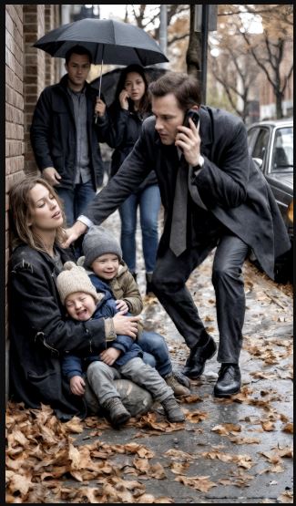 Sul marciapiede, una donna era accasciata come se le avessero tolto le forze con un solo gesto: cappotto troppo leggero, tessuto umido, capelli in disordine. Immobile. Accanto a lei, due bambini piccolissimi — un maschietto e una femminuccia, forse due anni — le stringevano le braccia e piangevano con un’angoscia che faceva male ascoltare.