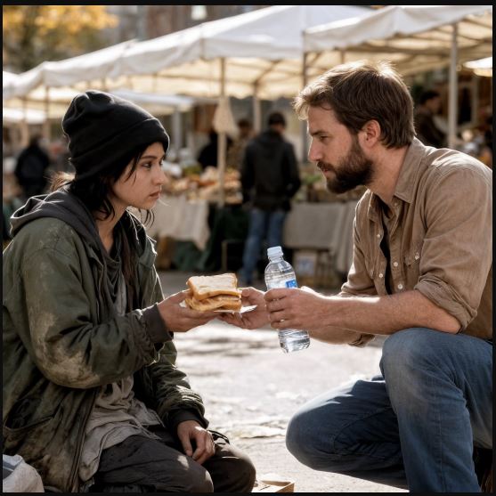 Le presi un panino e una bottiglia d’acqua. Quando glieli porgesi, abbassò lo sguardo, come se la gratitudine fosse una cosa troppo grande da mostrare in pubblico.