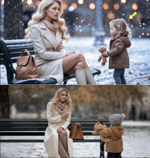 Davanti a lei c’era una piccola creatura che non poteva avere più di tre anni. Indossava un piumino rosso sbiadito, segnato dal tempo, e teneva stretto un orsetto spelacchiato con una mano guantata. Gli occhi — grandi, marroni, spalancati — brillavano di una speranza così limpida che faceva quasi male. I fiocchi di neve le si posavano sulle ciglia, e lei restava immobile, come se perfino respirare potesse rovinare quel momento.