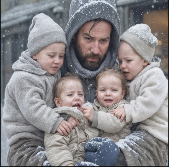 Erano troppo leggeri per quella stagione: giacche sottili, scarpe inadatte, guance arrossate dal gelo e labbra pallide. La più grande — una bambina di circa dieci anni — teneva un bimbo piccolo premuto al petto come fosse un’ancora. Due fratellini stavano accanto a lei, raggomitolati, gli occhi enormi e vigili.