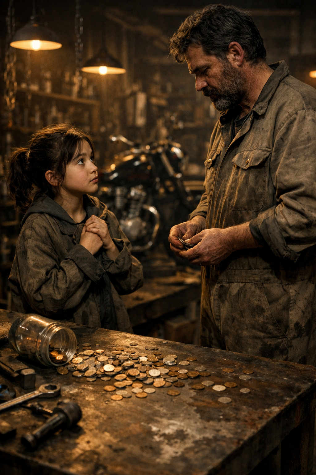 Non erano solo poche monete. Una vera valanga di rame rotolò sulla superficie metallica sporca di grasso, tintinnando e rimbalzando finché non si raccolsero in piccoli mucchi disordinati contro il bordo del mio banco da lavoro.