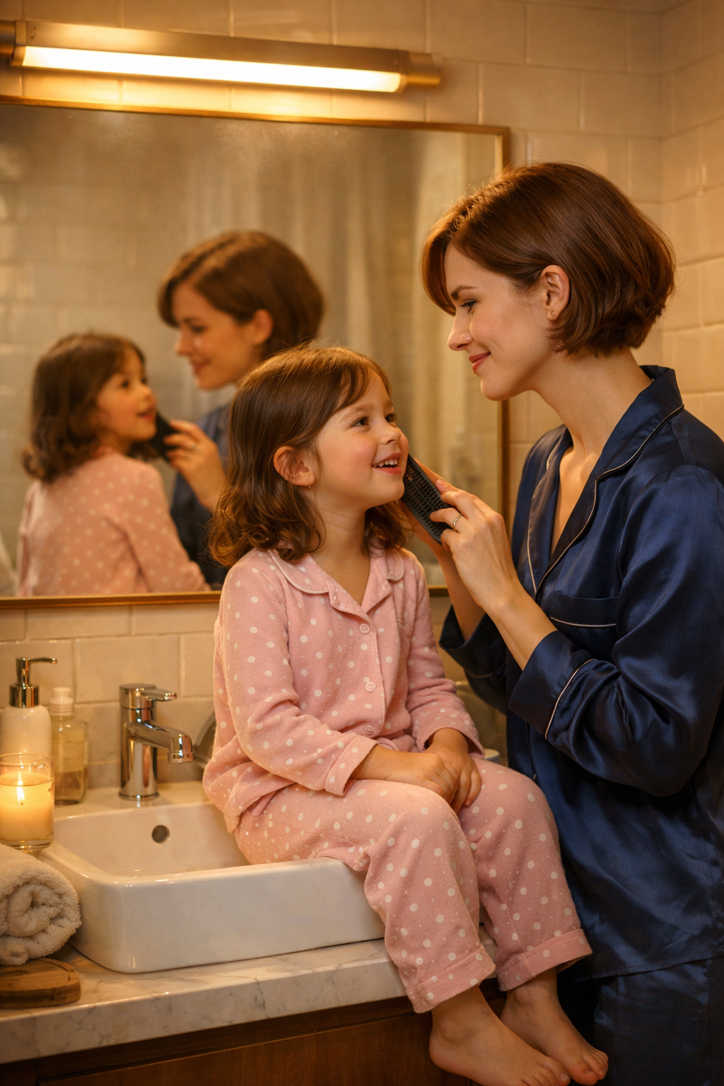 Le stavo spazzolando i capelli prima di andare a letto. Eravamo davanti allo specchio del bagno, le nostre riflessioni fianco a fianco, quando lei si è accigliata un po’ guardandosi e ha chiesto,