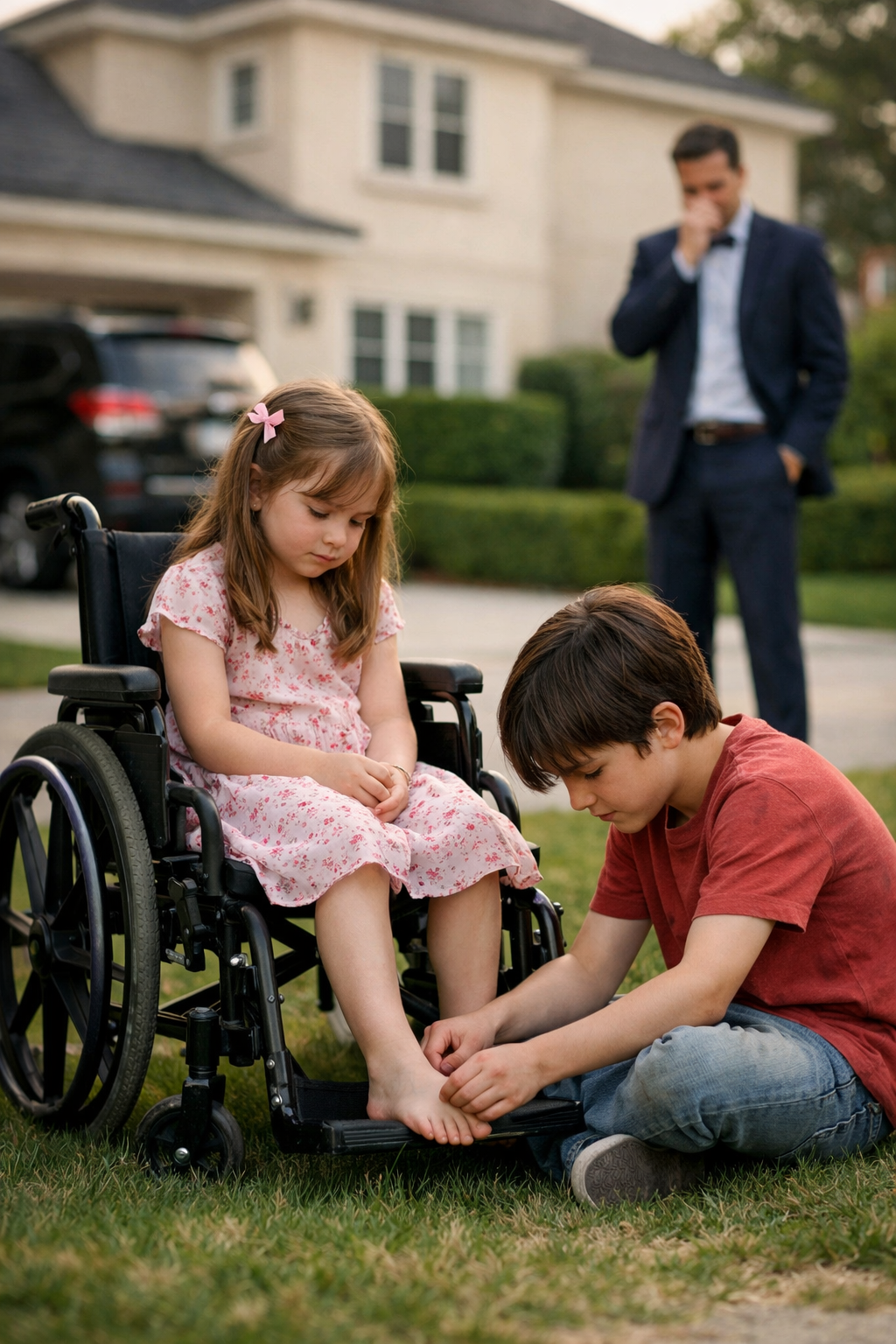 Sua figlia di sei anni, Lila, sedeva tranquilla sulla sua sedia a rotelle vicino all’isola della cucina. Indossava un abito azzurro chiaro che adorava.