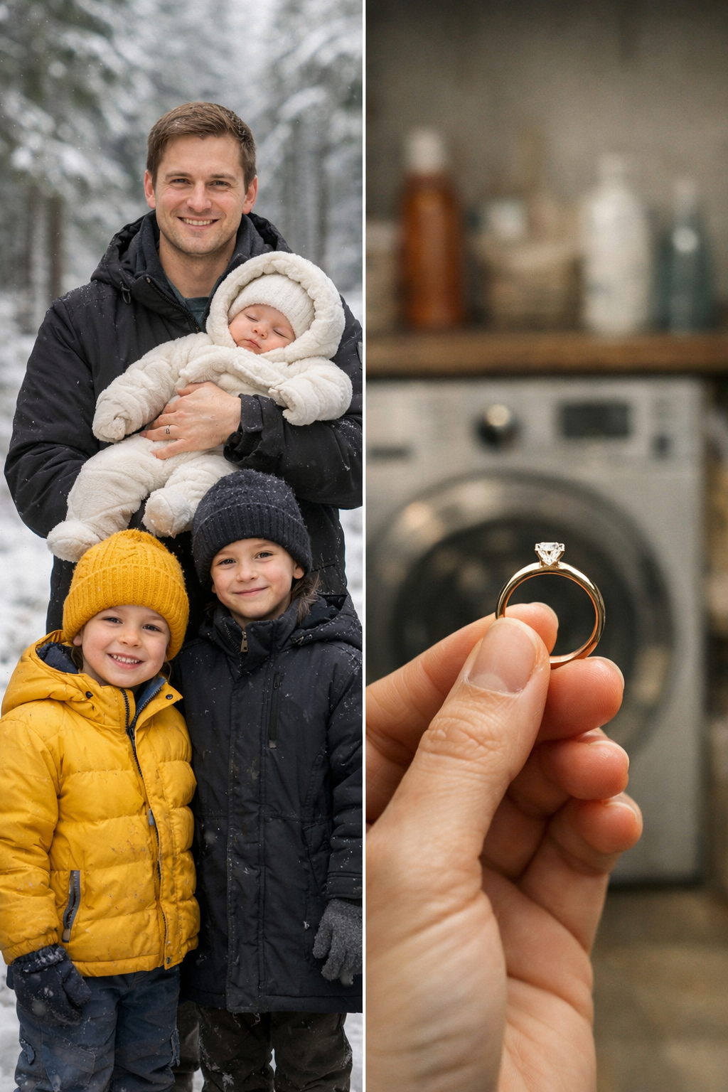 Rimasi lì, nel mio piccolo angolo lavanderia, mentre l’acqua gocciolava ancora dalla lavatrice, tenendo in mano la fede di qualcun altro mentre i miei tre figli si accalcavano intorno a me.