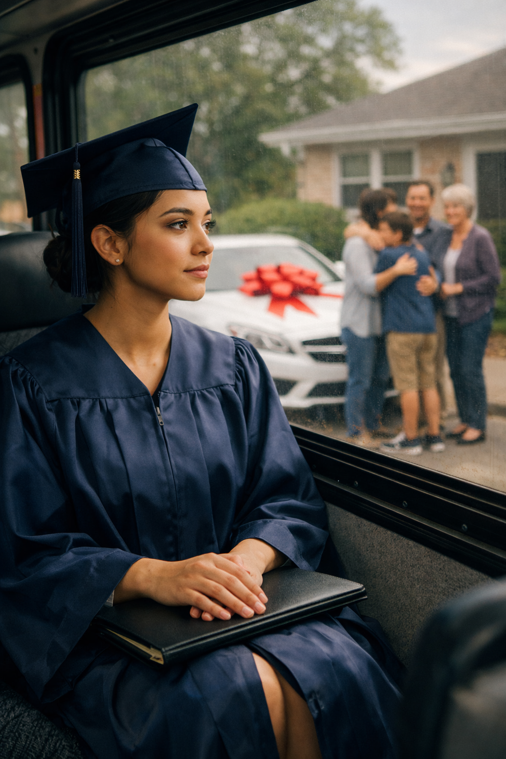 Quel viaggio in autobus fu l’inizio silenzioso di tutto ciò che venne dopo. Il sedile di vinile appiccicoso che si attaccava alle gambe per il caldo, il rombo del motore che vibrava nelle ossa, i volti degli sconosciuti che guardavano la mia toga con educata indifferenza — tutto sembrava più reale della famiglia che avevo appena lasciato indietro.