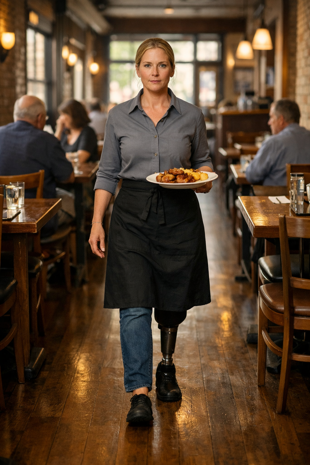 Ogni turno al bistrot iniziava allo stesso modo. Entravo dall’ingresso laterale alle 16:45 con il grembiule già allacciato, controllavo le prenotazioni, scambiavo qualche parola con Jenna al banco dell’accoglienza e poi cominciavo a muovermi nella sala con il particolare rumore che faceva la mia protesi sul parquet lucido. Clic, tonfo. Clic, tonfo. Il suono non era forte, non in senso assoluto, ma in un ristorante dove le persone pagano di più per una luce soffusa e un certo tipo di silenzio, qualunque rumore irregolare si notava, e il mio era il più irregolare di tutti.