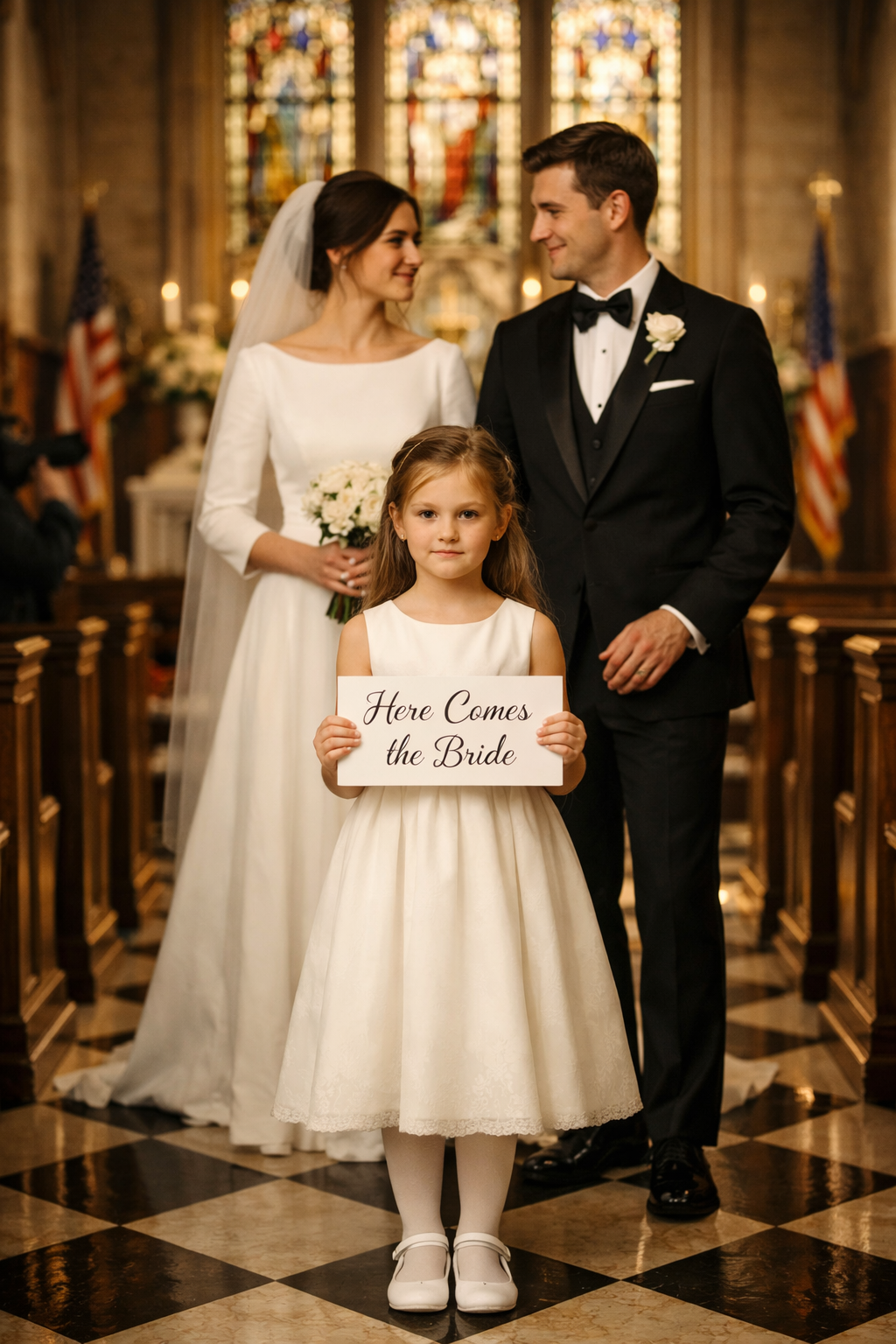 La mattina del matrimonio arrivò con quella particolare intensità dei giorni che hanno un peso maggiore di quanto una mattina normale possa sopportare. Ero in chiesa presto con le mie damigelle, e l’edificio faceva ciò che aveva sempre fatto con la luce del mattino, trattenendo il silenzio in quel modo proprio della pietra antica, con le vetrate colorate che gettavano blu e oro sui pavimenti. Emma era lì anche lei, nel suo vestito bianco con la fascia di raso, seduta su una sedia vicino ai cestini di fiori con un libro da colorare e il cartello che stava preparando in segreto da due settimane. Aveva detto a Daniel che era una sorpresa. Aveva detto lo stesso anche a me. Anche mia cugina, che era stata incaricata di custodire tutte le informazioni sul cartello, lo aveva visto finito solo la sera prima ed era venuta da me con gli occhi spalancati dicendomi che dovevo sapere che esisteva, e io avevo detto che mi sarei fidata del giudizio di Emma.