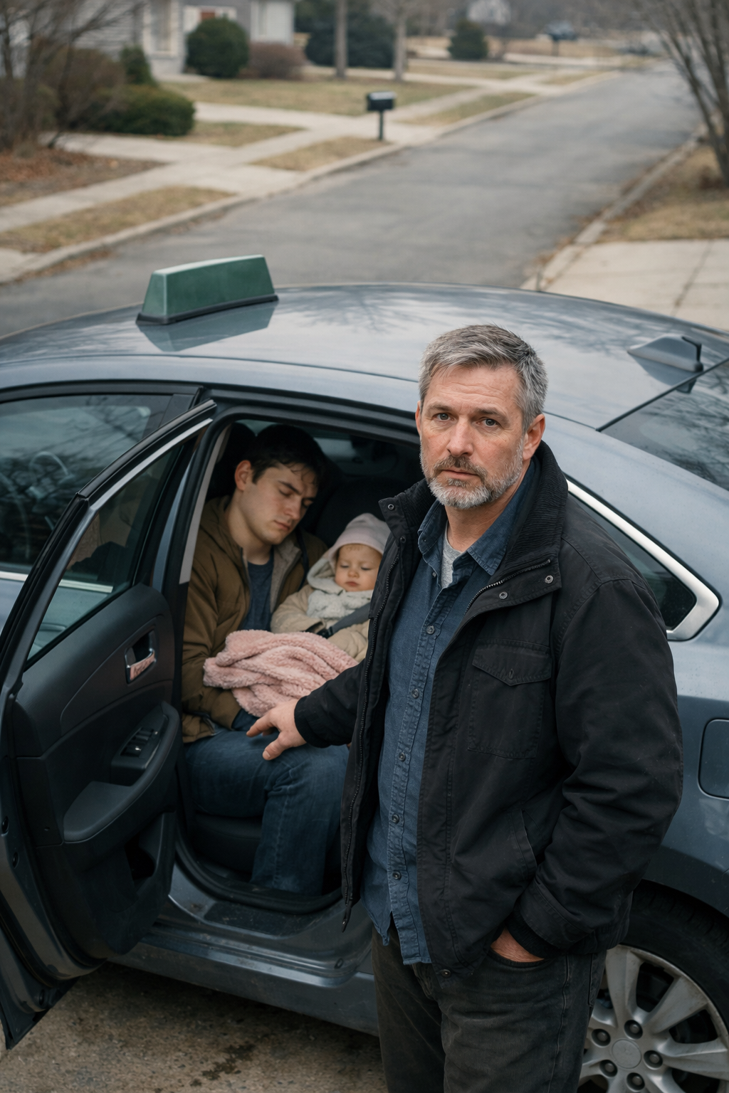 Mio figlio era rannicchiato sul sedile posteriore con le ginocchia piegate e la testa appoggiata al vetro, i capelli appiattiti da un lato e una leggera barba che mi diceva che non si radeva da giorni. La bocca era leggermente aperta. Stretti a lui, sotto una coperta sottile, c’erano due sagome più piccole. Un braccio piccolo era disteso sul suo petto, dita chiuse nel sonno. Sul pavimento tra i sedili: una bottiglia d’acqua di plastica, un sacchetto vuoto di fast food, un unico calzino da bambino.