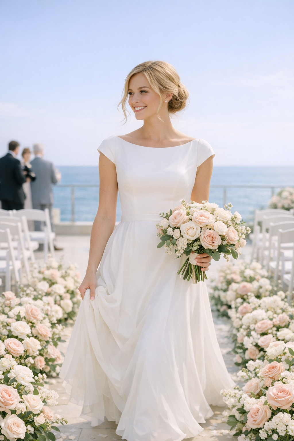 Ho provato quattro abiti. Il quarto era quello giusto. Crepe di seta. Nessuna perla. Nessun pizzo. Nessun ornamento che avesse bisogno di spiegazioni. Cadeva dritto dalle spalle e si muoveva quando mi muovevo e stava in silenzio come sto in silenzio io — non perché non avesse nulla da dire, ma perché non aveva bisogno di dirlo ad alta voce.